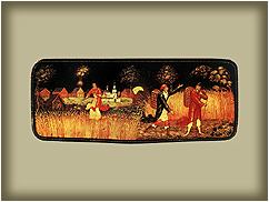 Темы произведений художников Палеха - излюбленные в фольклоре мотивы крестьянского труда, хороводы, тройки, битвы, песенные и исторические сюжеты, сказки, былины. Мастера прекрасно сочетают живописные композиции с формой миниатюрных шкатулок, ларцов, тарелок, коробочек, пластин , пудрениц.