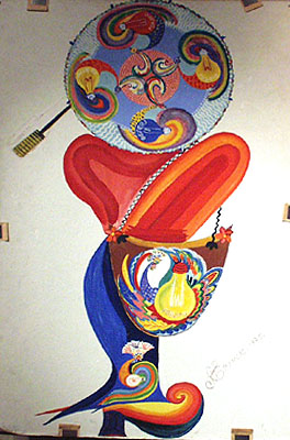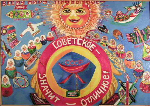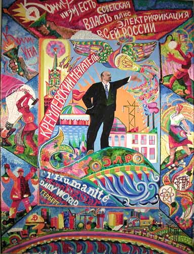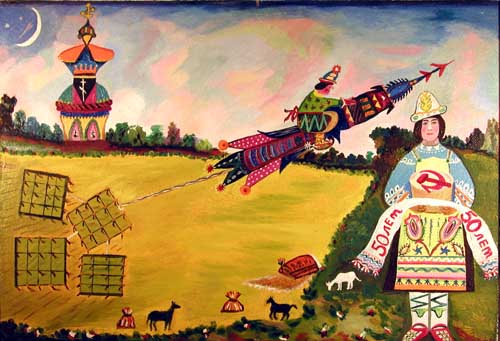 Еленок Татьяна Дмитриевна. 1930 г.р. Москва Летающий пролетарий. 1973 Х. на доске, масло, металл. Накладки.74,5х54,5 |