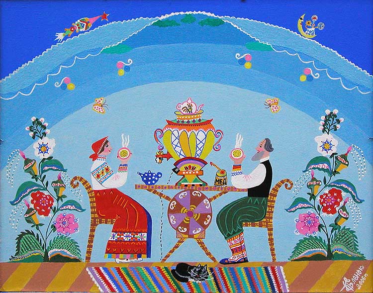 Еленок Татьяна Дмитриевна 1930 г.р. Москва Благодушное чаепитие. 2006 Картон, пастель, масло. 40х50 |