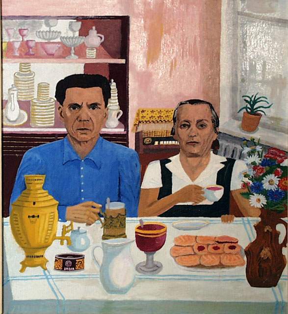 Сарычев Иван Семенович 1910-1990 гг. Курган Автопортрет с женой. 1986г. Картон, масло. 60х50 Собрание ММНИ |