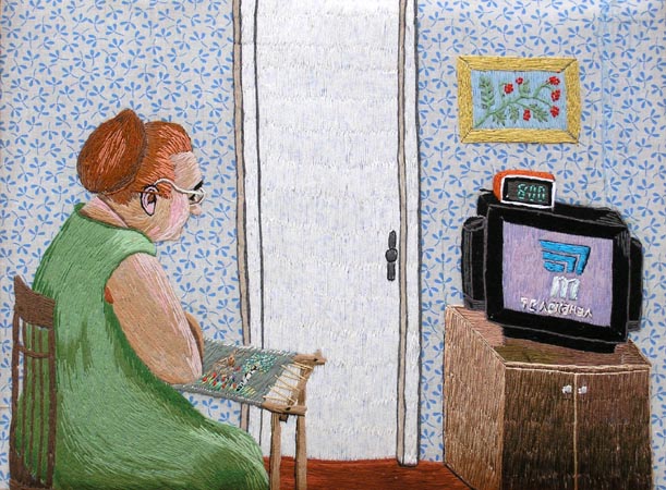 Семейкина А. П. Пермь Моё любимое телевидение – Пермский канал ТВ-7. 1990 Ручная вышивка. 39х54 |