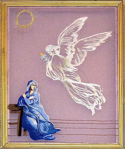 Семейкина А. П. Пермь Благовещение. 1998 Газ, шелковые нитки, мулине, ручная вышивка, верхошвы. 58х43 |