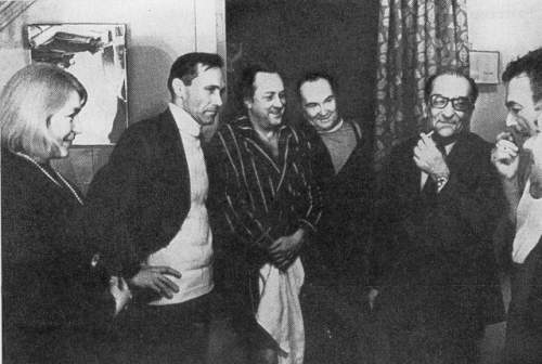 В.М. Шукшин с Р.А. Товстоноговым и актерами Ленинградского академического театра имени Горького после спектакля "Ханума" по пьесе А.Цагарели.