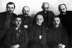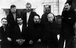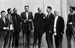 Старейшие живописцы Палеха, организаторы артели лаковой миниатюры. В верхнем ряду (справа налево): И. Голиков, Н. Зиновьев, А Котухин,А. Баканов, в нижнем ряду: И Баканов, А. Глазунов, А Зубков, И Маркичев. 1932 |