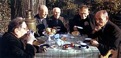 Палехские мастера старшего поколения в часы досуга. Кон. 1960 г.Слева направо: А. Дыдыкин, Н. Зиновьев, М. Дыдыкин, И. Вакуров, Н. Правдин. |
